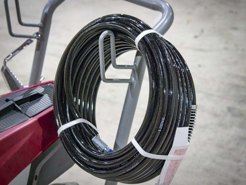Of the four ControlMax Residential sprayers Titan offers, the 1700 Pro and 1900 Pro are mounted on two-wheeled carts for mobility and convenient adjustment. The pump is enclosed in a polymer casing with a storage compartment on top. You can store extra tips, tip guards, your keys, wallet, or whatever in there. The red button is the Sureflo Pusher Valve that ensures priming. The spray gun and pump are connected with a 50-foot hose and the whole system has a 2-year warranty.