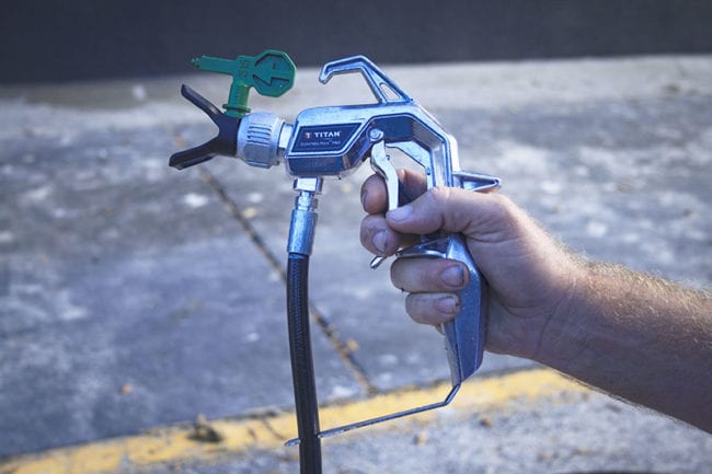 A ControlMax Spray Gun makes up the business end of the system. Pros will recognize it as a bare-bones, utilitarian design, not unlike many other spray guns. It’s certainly a no-frills design but it has an ergonomically correct, decently comfortable handle and a hook. A lock prevents errant spraying and potential messes. But it’s much different than Titan’s high-end RX-PRO that Richard Nicholson reviewed last summer.