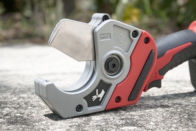 Importantly, there’s a trigger lock since the damage the sharp, stainless steel blade and the aluminum jaws’ 1,900 inch-pounds of pressure can cut a lot more than PVC. It’s helpful to keep in mind that the tool isn’t just for PVC – it can also handle CPVC, PEX , BlazeMaster, ABS, non-metallic conduit, and rubber hose. Milwaukee claims the Shear can cut over 200 times on a charge, so I’m going to do all I can to check the company’s math!