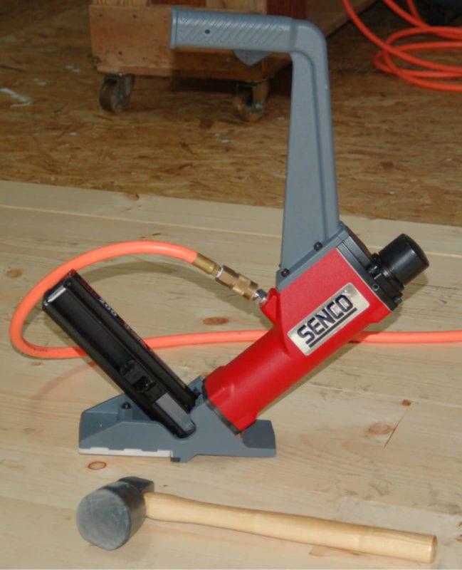 Upon unboxing the Senco SHF200, I was impressed with both the protective carry case and contents. ย The nailer comes with a high quality flooring mallet, oil, ยผโ air fitting, wrenches, safety glasses, and a solid plastic carry case. ย The tool feels solid and well-built in your hands. The use of an extra-long handle by Senco was impressive โ making the install ย easier on my back, something we can all appreciate.