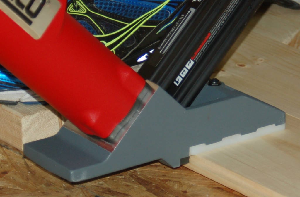 During the install we experienced only four โmisfiresโ and these were due to user error โ weak mallet strikes on the actuator. If you hit the actuator too weakly, it does not open completely to let the full blast of air in, and then wonโt completely drive the fastener. Still, it doesnโt take a massive strike, either. Just as an experiment, I was able to use the heel of my hand to deliver enough force for a full drive. ย Like the Mythbusters tell us on each episode, donโt try this at home, weโre what you call โprofessionalsโ. We did notice you need to keep an eye on your nail supply as several times we got into a rhythm and would run out of ammo and dry fire the nailer. ย We quickly learned to keep the nail level topped off to avoid stoppage of work and keep the nails and project rolling.
