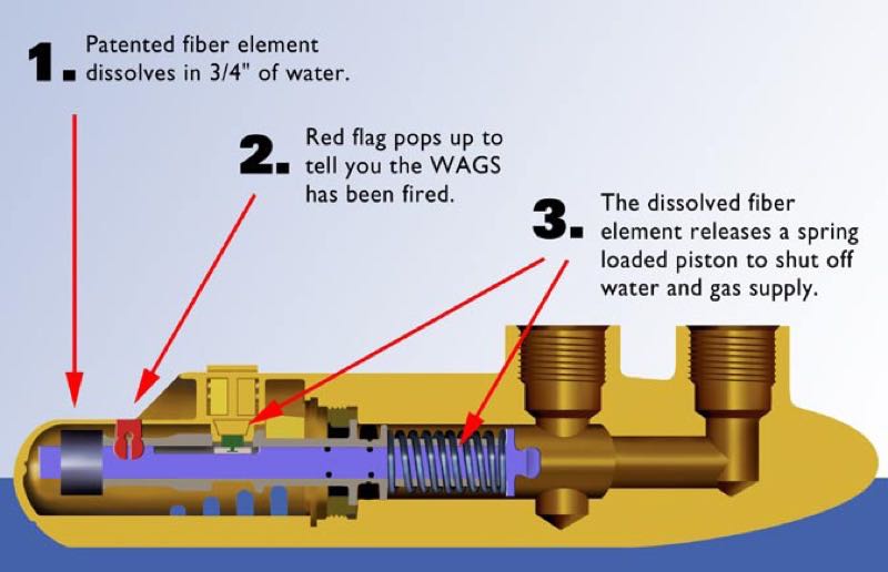 The valveโs action is based on fiber element technology developed for the British Royal Air Force to inflate life jackets automatically. Once activated, the valve shuts off the water and the gas supply.