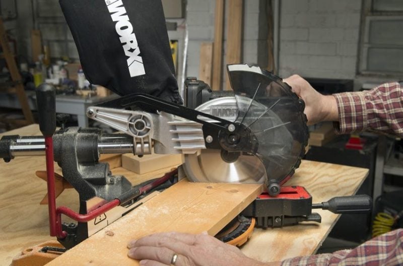 Lastly, the Worx cordless sliding miter saw comes with a dust bag to keep your workspace tidy. If you have access to a shop vacโwhich we highly recommendโyou can attach the hose to the sawโs 1-5/8โณ dust port.