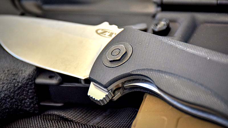 For deployment, the ZT 0909 employsย a KVT ball-bearing opening system, which is triggeredย by a finger flipper. It has a hex pivot nut and bolt, which I didnโt find to beย the best looking, but functions well. The blade length is 3.8 inches with a handle length of 4.75 inches and a weight of 7.5 ounces.